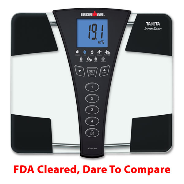 The BC-549plus IRONMAN® Body Composition Monitor from Tanita, offers both an expanded weight range and larger platform. This highly accurate FDA cleared body composition monitor not only measures weight and body fat, it also tells you your muscle mass, body water %, basal metabolic rate (BMR), metabolic age, bone mass, visceral fat and rates your physique! The muscle mass feature indicates the weight of muscle in the body. The Body Water % is the total amount of fluid in the body expressed as a percentage of total weight. The BMR is the daily minimum level of energy or calories your body requires when resting (including sleeping) to function effectively. The Metabolic Age compares your BMR to the average age associated with that level of metabolism. The Bone Mass is the weight of your bone in your body. The Visceral Fat is the fat in the abdominal cavity (stomach), surrounding the vital organs. The Physique Rating is a rating of your body type; 1-9.