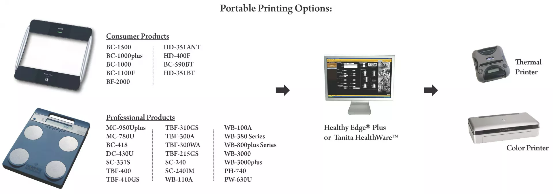 Providing a professional color report for yourself or your clients has never been easier. Bundle this color printer with your Tanita scale and PC running Tanita’s Healthy Edge or Health Ware software. This mobile, wireless, battery powered printer offers a convenient solution to providing impressive assessment reports on the go, perfect for health screenings. Simple plug and play operation with no need for special forms, uses standard printer paper to assure on-going low cost of operation.