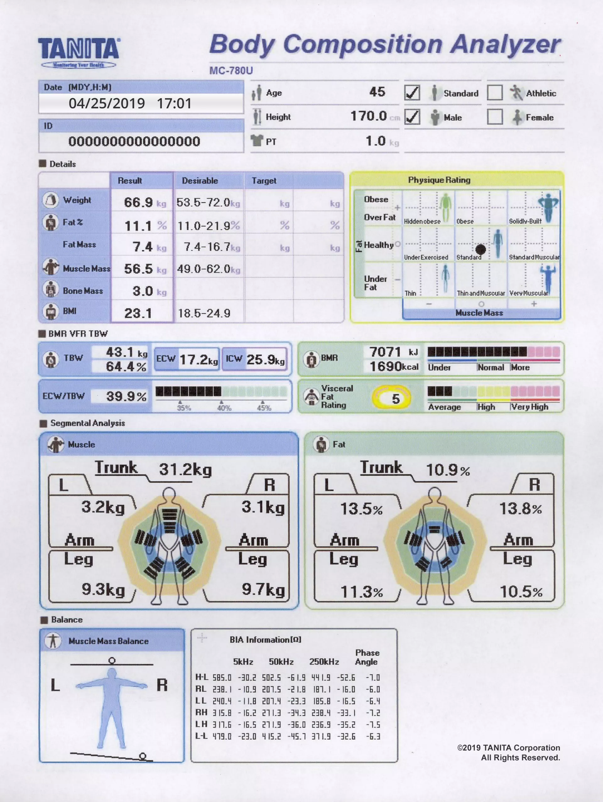 The MC-780U is an FDA cleared 510(k) type 2 medical device, with a weighing capacity of 600 lb (270 kg) and auto calibrates before each and every analysis, ensuring optimum reproducibility of measurements. It uses BIA (Bioelectrical Impedance Analysis) technology, which sends a safe, low-level electrical signal from footplate and hand electrodes through the body. BIA is quick and non-invasive, and one of the most thorough and reliable ways to measure body composition, clinically comparable to DEXA (dual-energy x-ray absorptiometry) and hydrostatic (underwater) weighing.