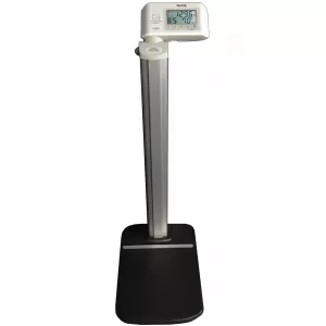 Integrated stadiometer on column mounted display provides efficient measurement of height, suitable for both children and adults. Includes rotating display and platform castors.