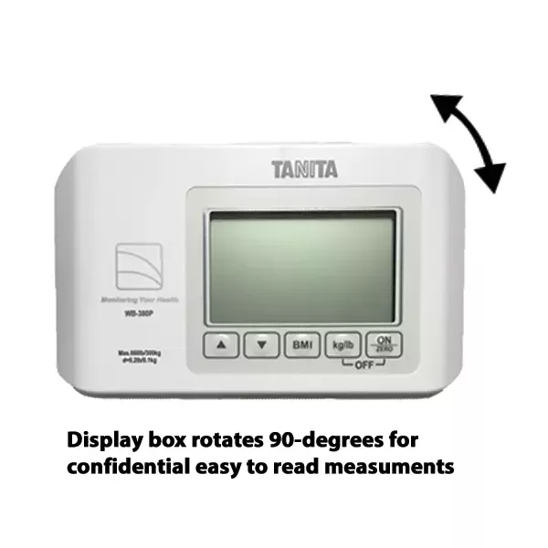 A column mounted display with an extra-large LCD display is positioned 45” off the floor for easing viewing, and can be rotated 90 degrees for viewing in any situation. An Integrated stadiometer provides efficient measurement of height, suitable for both children and adults. Castors on the base of the WB-800H plus platform make moving it from room to room effortless.